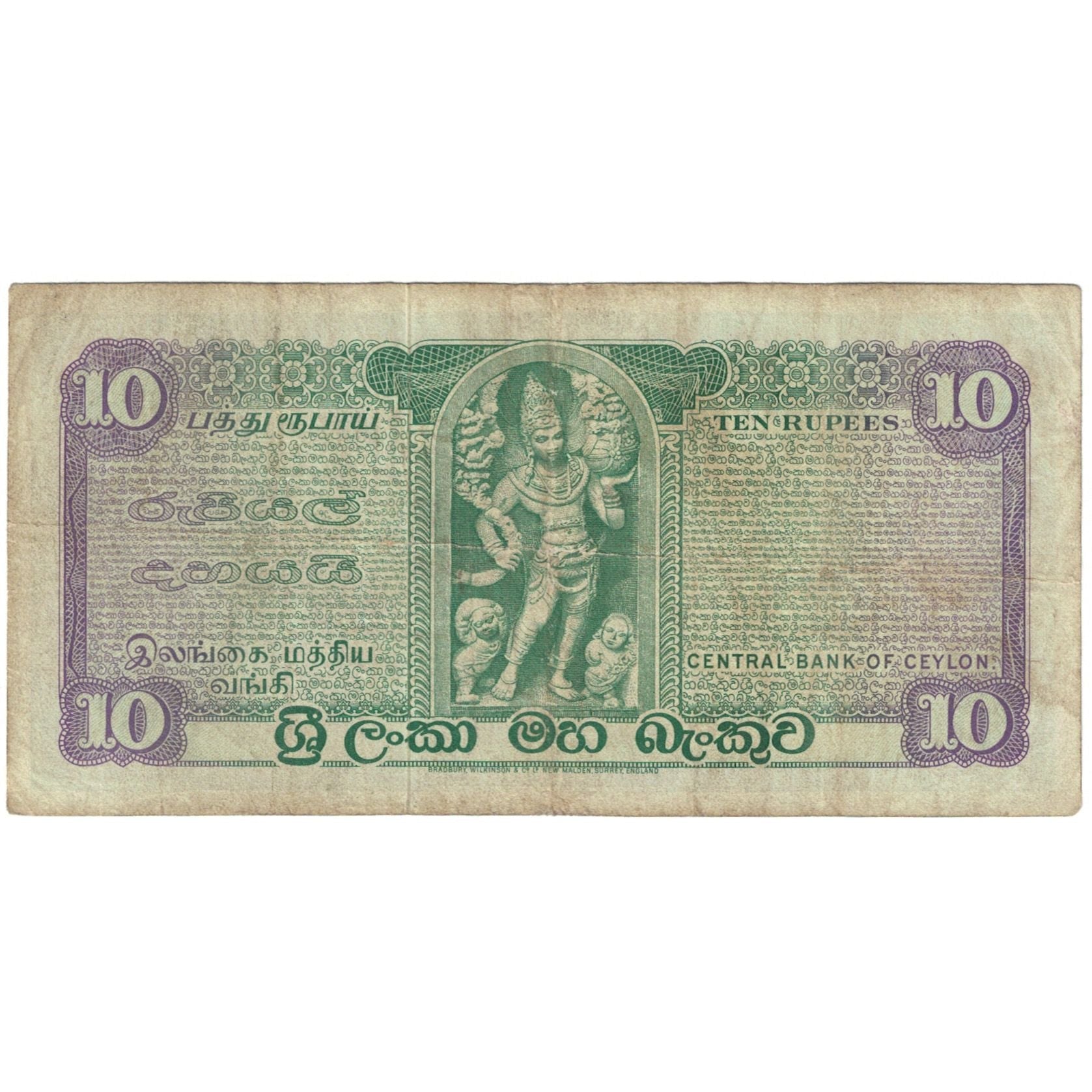 Vpravo, socha kráľa Parakramu. Rituálne postavy. Zelená a fialová na oranžovej a modrej potlači.